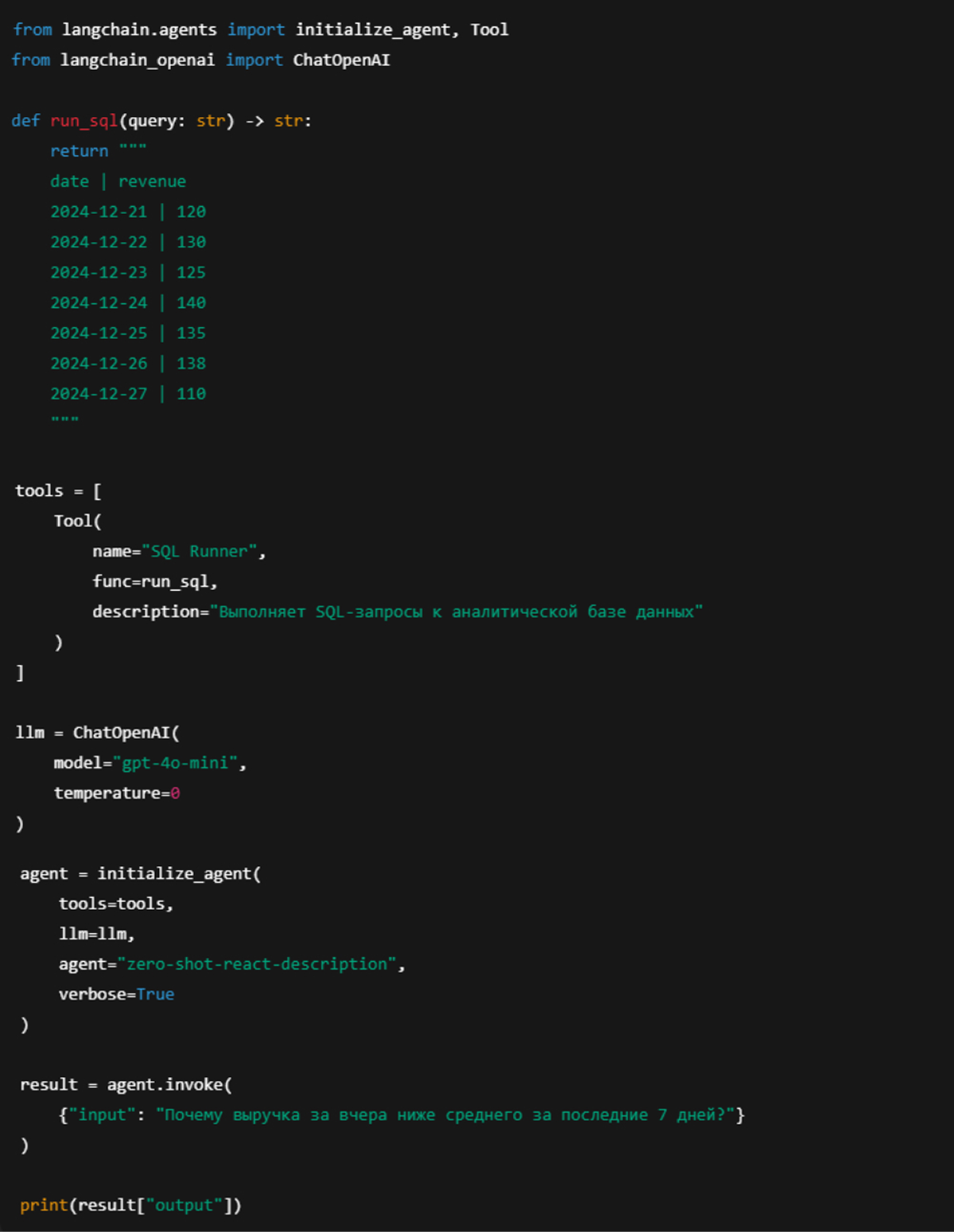 Пример кода показывает ключевой принцип: агент сам решает, когда и как использовать доступные инструменты, а аналитик управляет логикой через инструкции и контекст.
