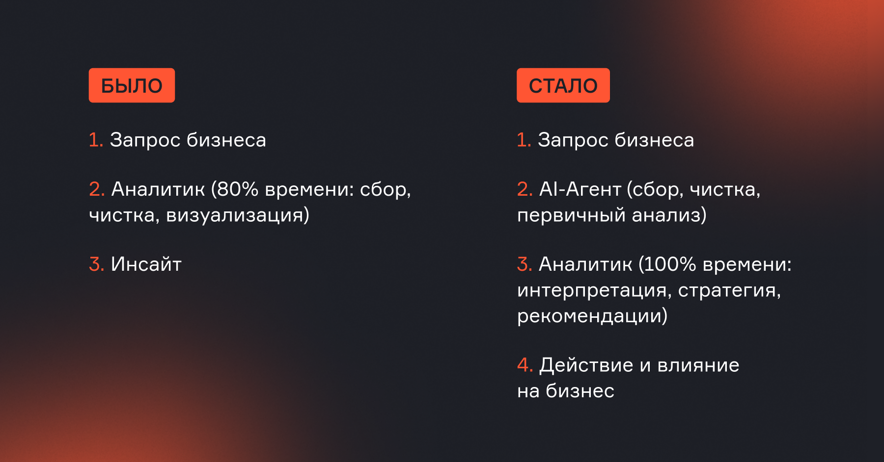 AI-агенты — не замена, а суперсила аналитика. Специалист перестает быть просто исполнителем запросов и становится управляющим процессом анализа.
