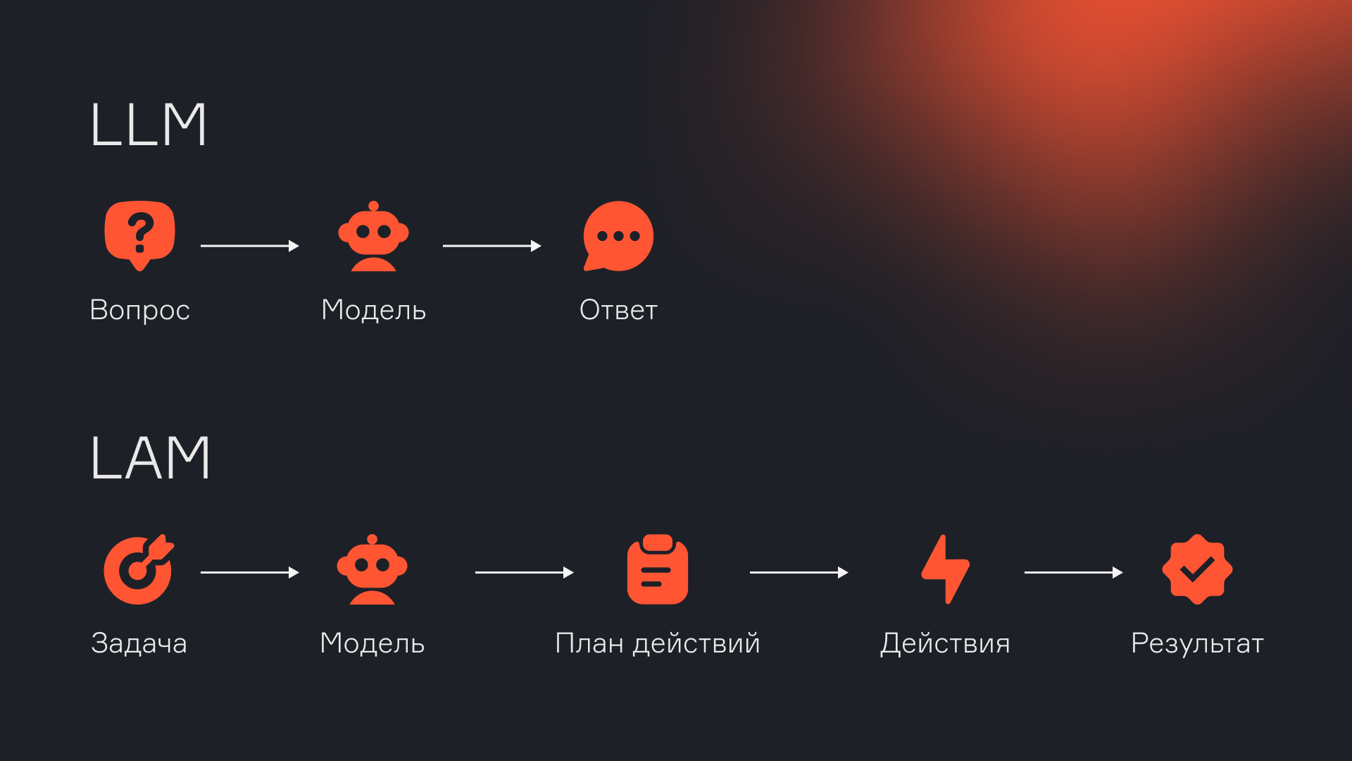 | Большая языковая модель (LLM) | Большая модель действий (LAM) | |
