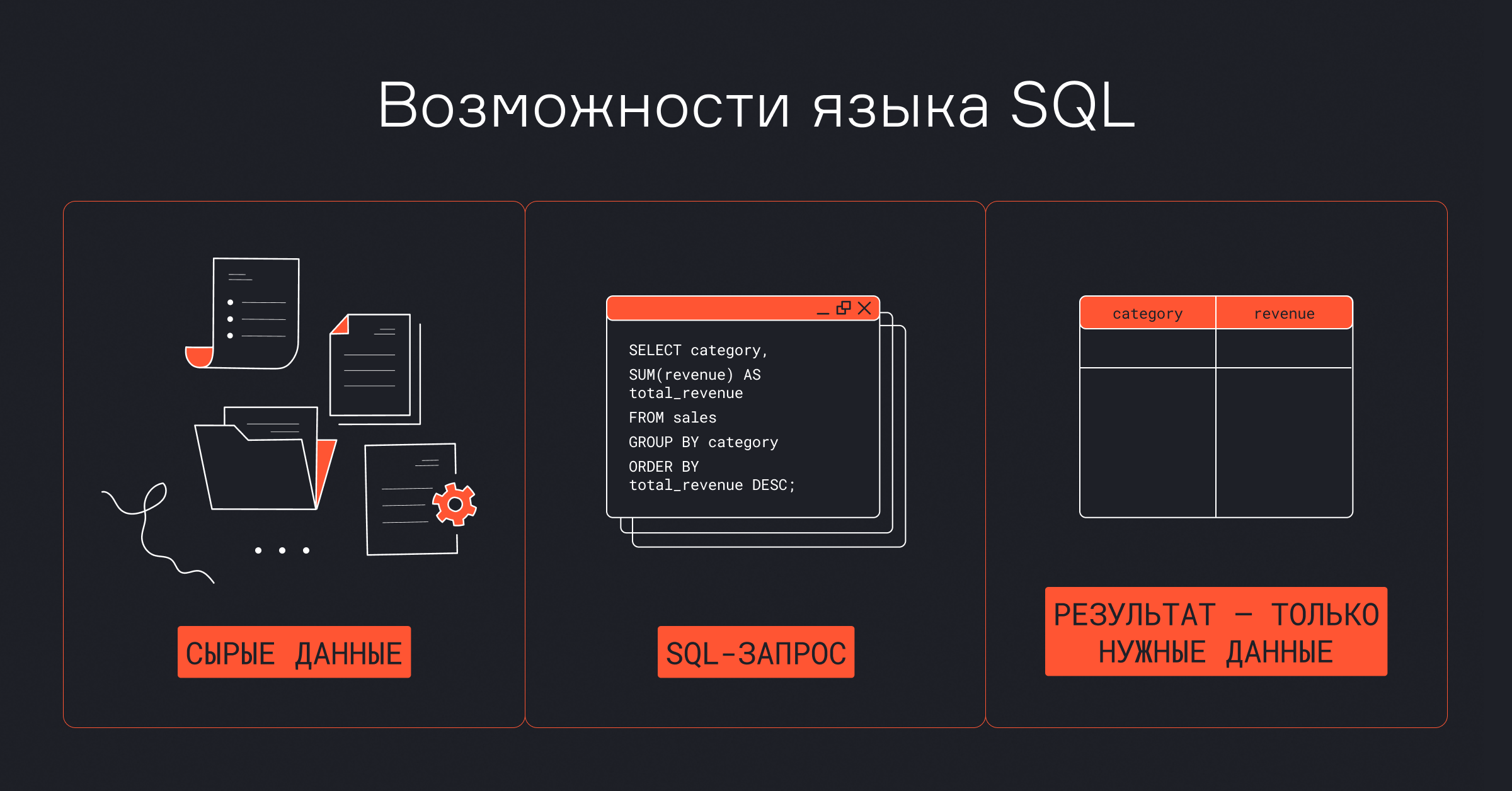 Работа аналитика почти всегда начинается с баз данных. Там хранятся заказы, действия пользователей, переходы по рекламе — все, что нужно для анализа. Только не в готовом виде, а в десятках и сотнях таблиц. Чтобы достать из них только нужные данные, аналитики используют SQL.