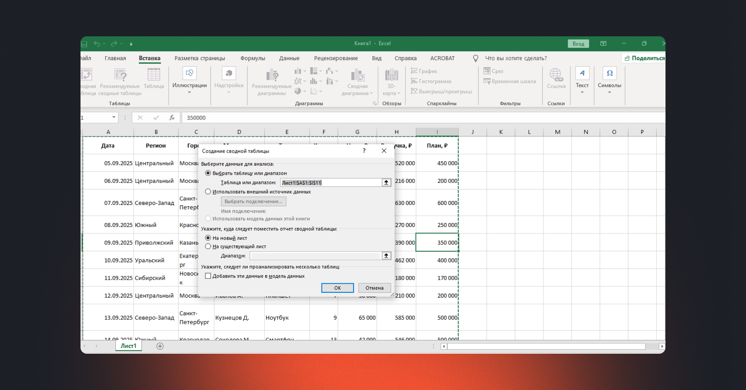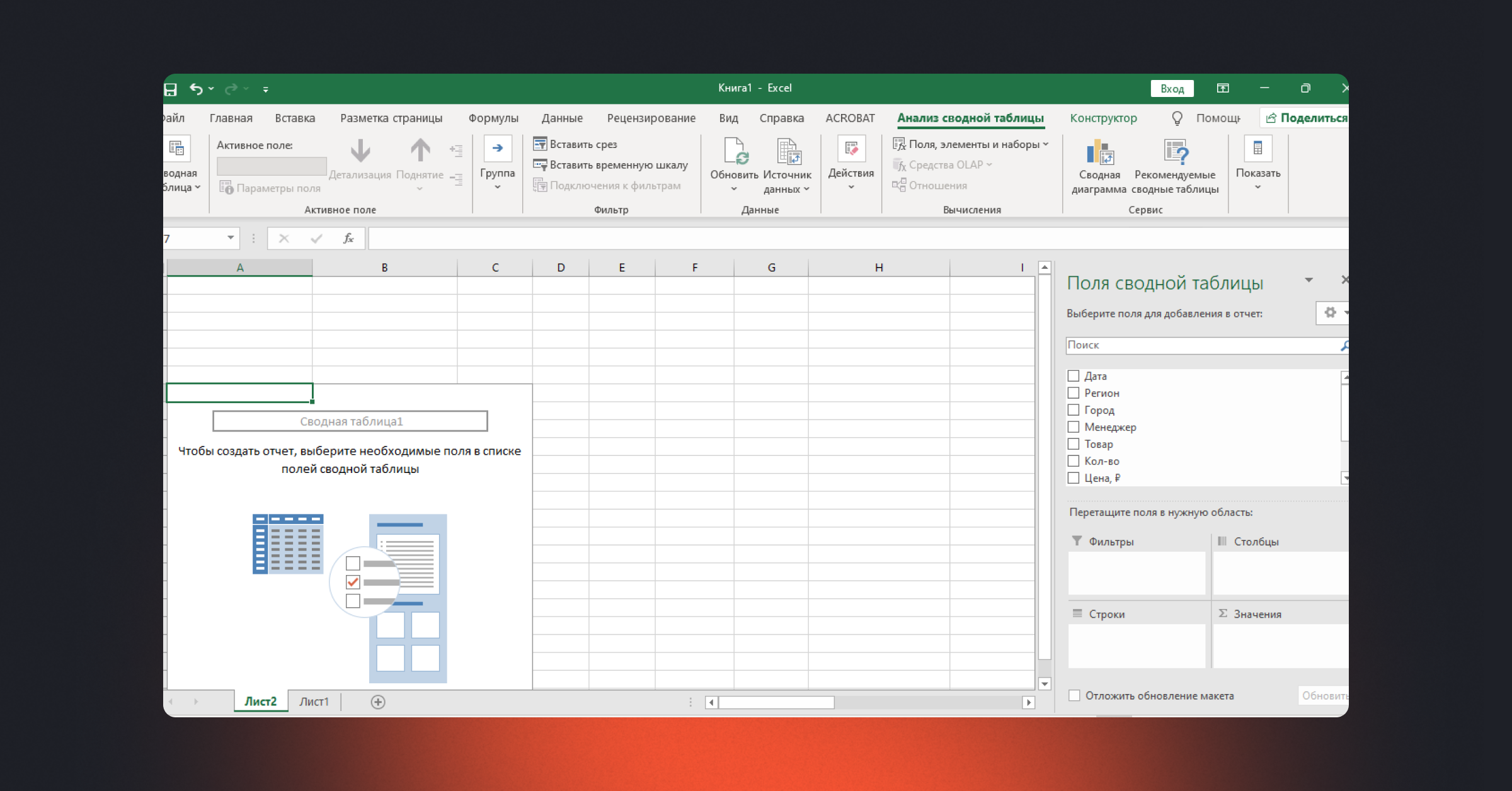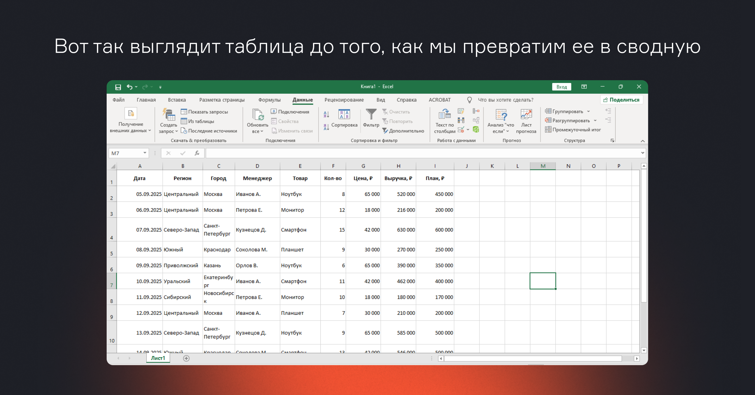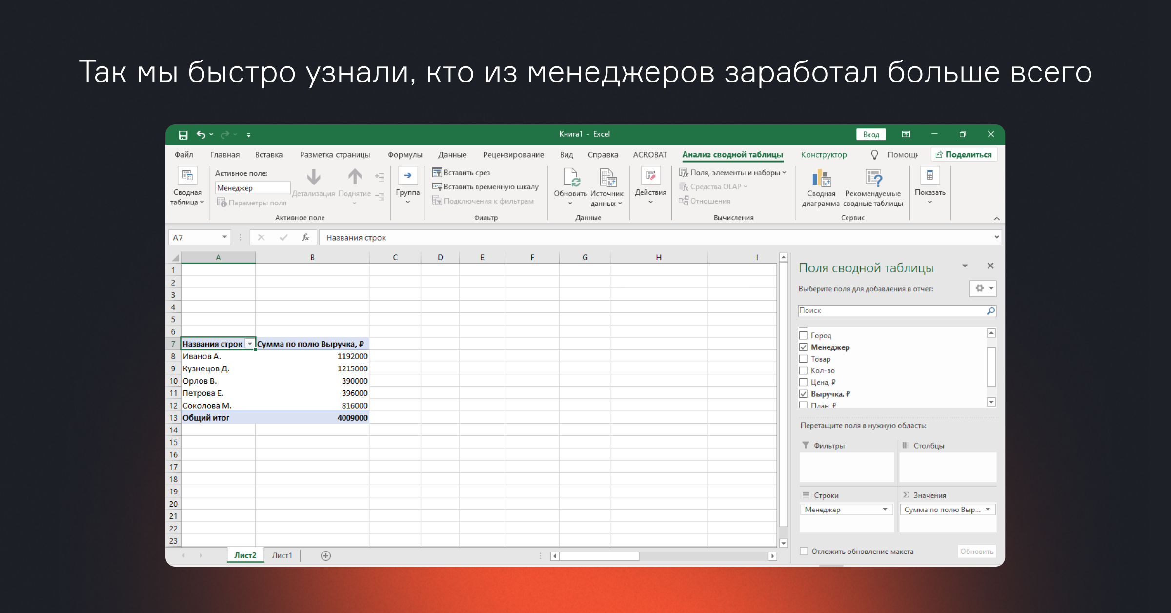 Представьте: отдел продаж ведет огромную таблицу с заказами, в которой сотни строк и десятки столбцов. Менеджеру нужно быстро понять, какие регионы приносят больше прибыли и кто из сотрудников перевыполнил план. Перебирать строки вручную будет очень долго и практически бессмысленно. Когда нужно быстро навести порядок в данных, поможет особый инструмент Excel, который моментально структурирует массив информации, чтобы стало понятно, как распределяется выручка по городам и кто из менеджеров лидирует.