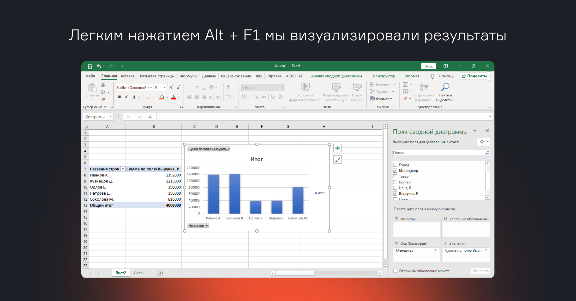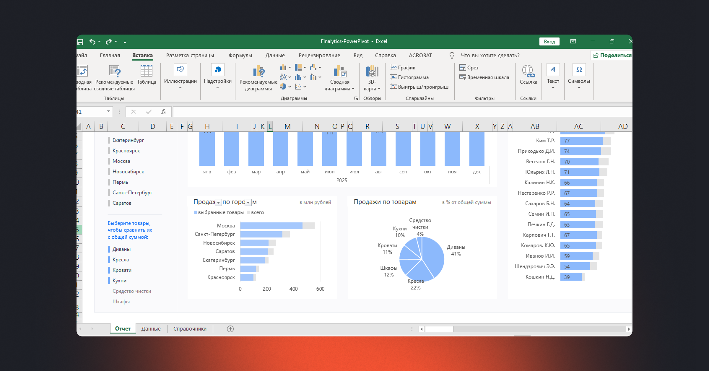 Excel позволяет строить диаграммы прямо на основе сводной таблицы — при изменении фильтров или срезов график обновляется автоматически. Это удобно для презентаций, обсуждений и принятия решений.