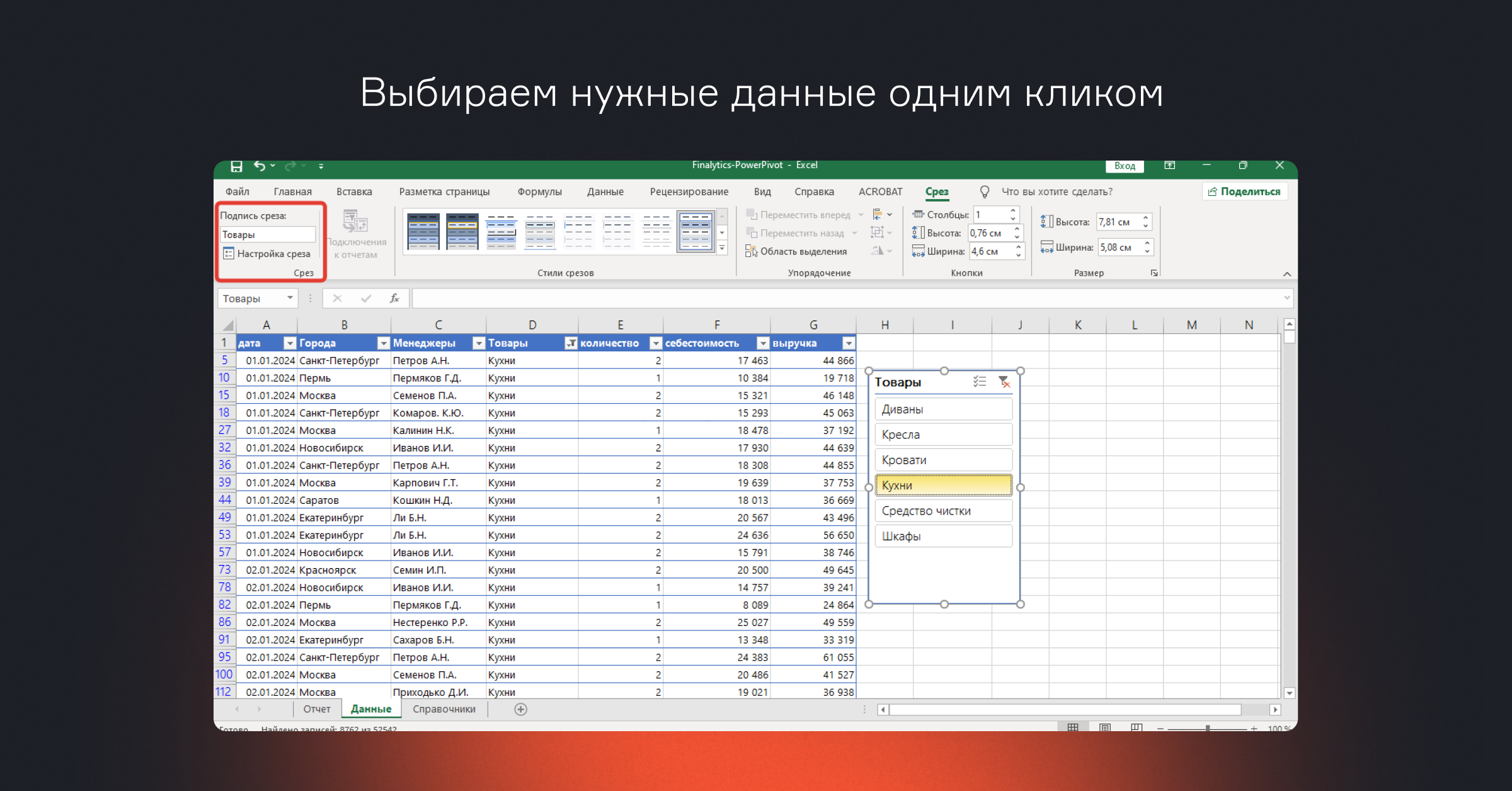 Срезы представляют собой наглядные кнопки, позволяющие легко выбирать нужную категорию данных — например, продукты, отделы или временные периоды. Благодаря им сразу видно, какой фильтр используется, а работа с отчетом становится проще и динамичнее.