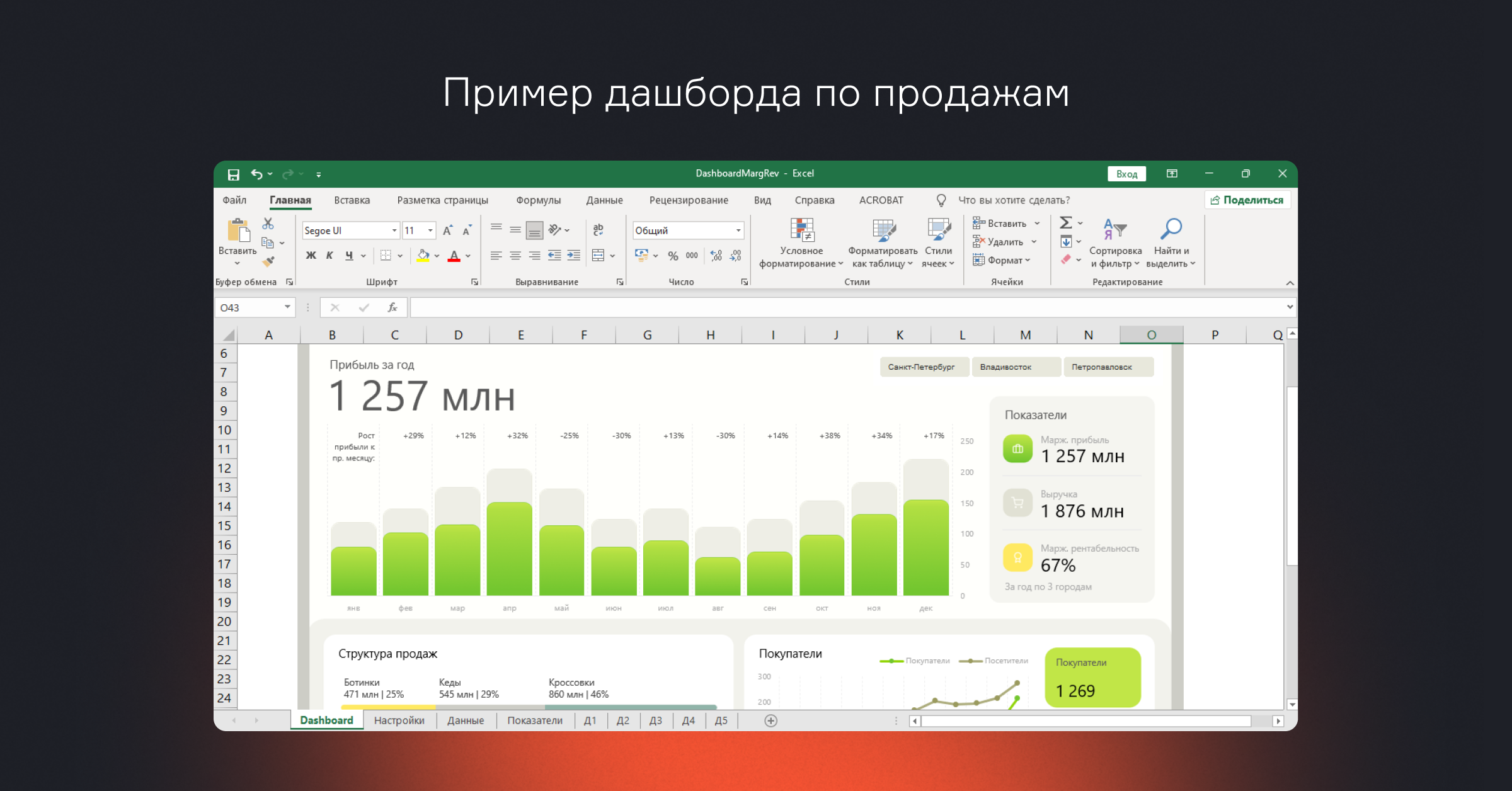 Вынесите все диаграммы и срезы на отдельный лист Excel — это и есть ваш дашборд! Теперь вы видите всю картину продаж за пару кликов, быстро сравниваете данные и делитесь наглядными визуализациями с коллегами.