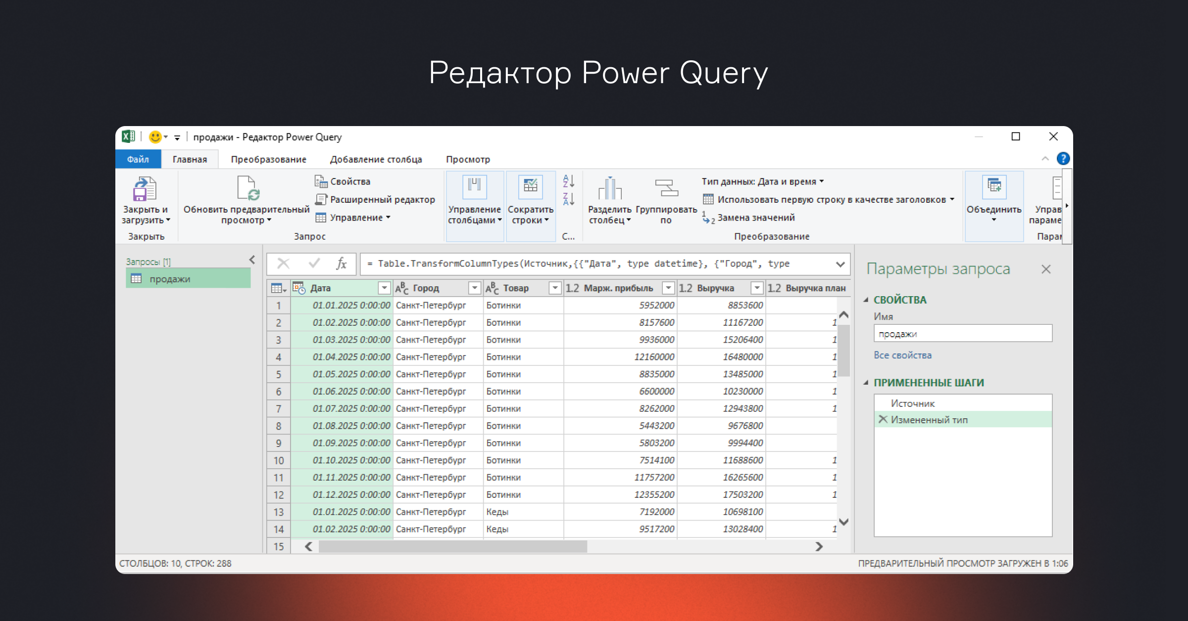 Удобный инструмент для импорта и преобразования сведений из экселя, БД, веб‑сервисов и текстовых файлов. Настройте требуемое подключение и правила обработки данных. Впоследствии достаточно нажать «Обновить все» — таблицы мгновенно подтянут свежие данные и пересчитаются автоматически.