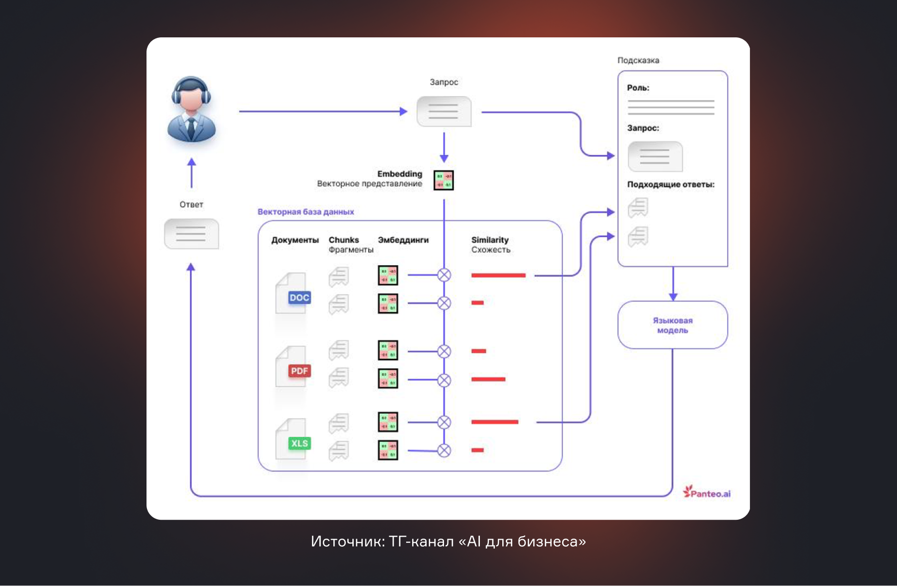 • Библиотекарь (Retrieval): мгновенно ищет и извлекает релевантные фрагменты во всей вашей корпоративной базы знаний — договоры, инструкции, презентации, история обращений в CRM.