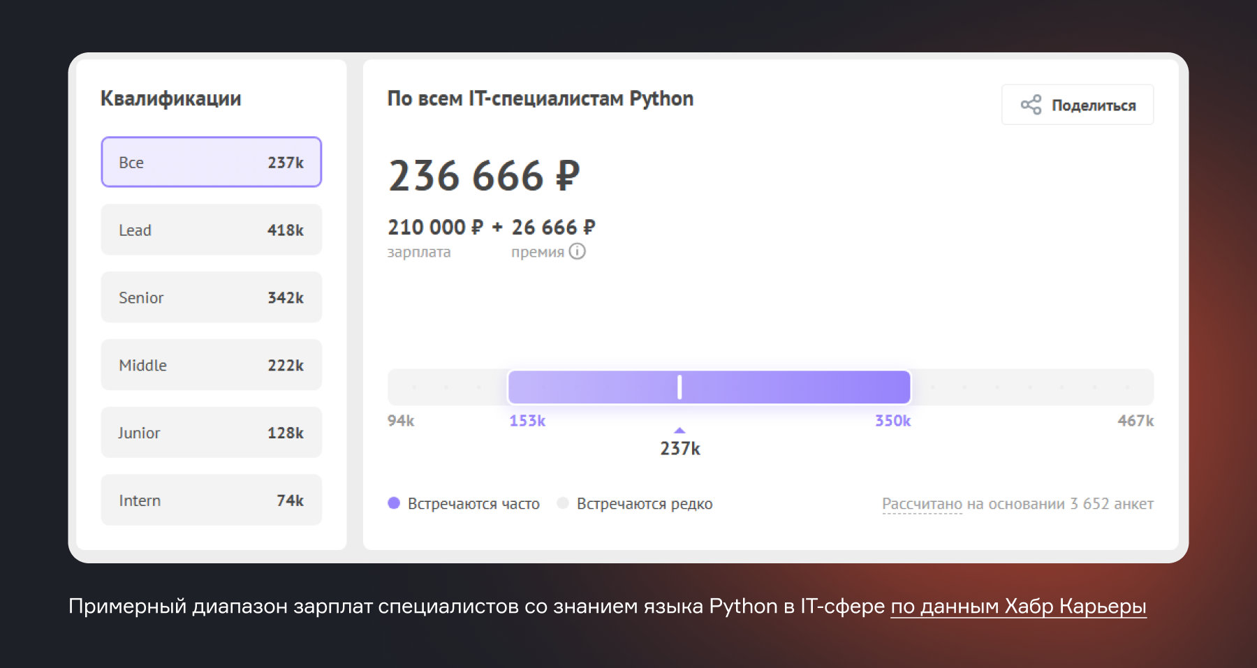 Аналитика ведущих площадок по поиску работы стабильно показывает, что этот язык входит в тройку самых востребованных у работодателей. Поэтому одно из наиболее весомых преимуществ Python в том, что вы получаете не просто теоретические знания, а конкретный инструмент для трудоустройства с широким выбором карьерных траекторий.